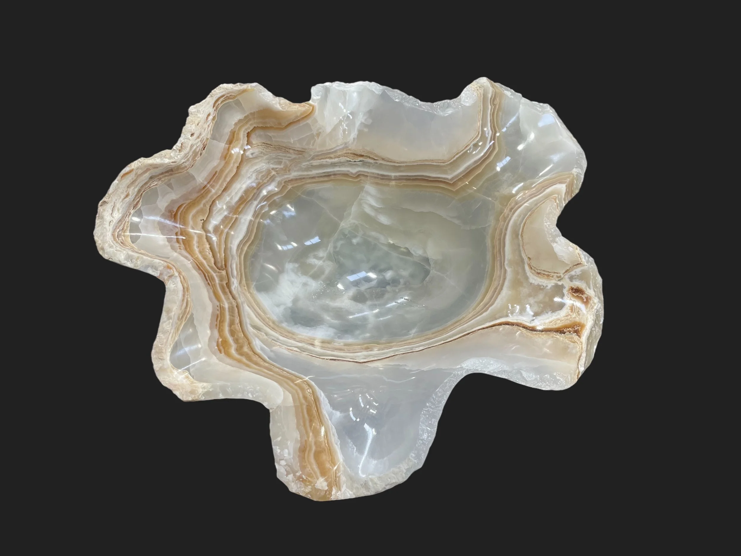 A beautiful labradorite stone carved to a small size bowl. It features patterns and unique tones of shiny blue and green colors. This perfect piece for any space.